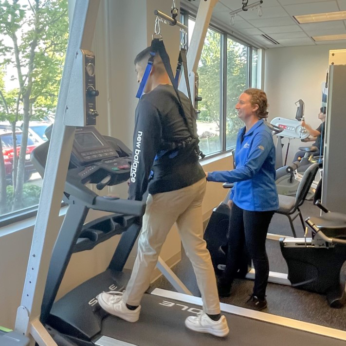An unweighted treadmill system uses a harness to partially suspend a patient’s body weight above a traditional treadmill. Without the full force of gravity pulling them down, there is much less strain placed on the body’s muscles, joints, and bones. The patient feels the safety of the harness, making it easier to move through their rehabilitation process with ease and confidence. Patients who have recently had lower extremity surgery or have issues with balance are great candidates for unweighted treadmill training. Since there is almost no risk of falling, the patient can concentrate on recovery rather than the fear of slipping or tumbling.